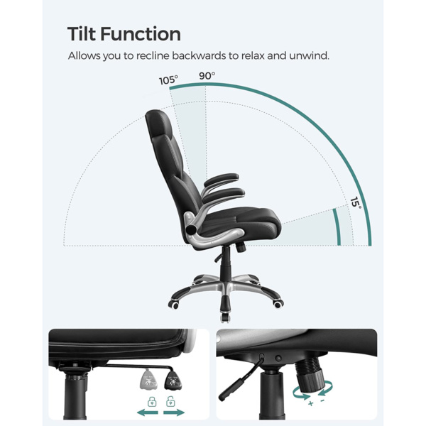 • Vietos taupymas: Visų pirma baigti darbą! Atlenkite šios biuro kėdės porankius ir pakiškite kėdę po stalu, kad sutaupytumėte vietos.