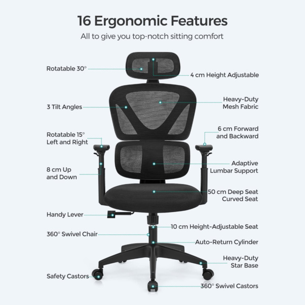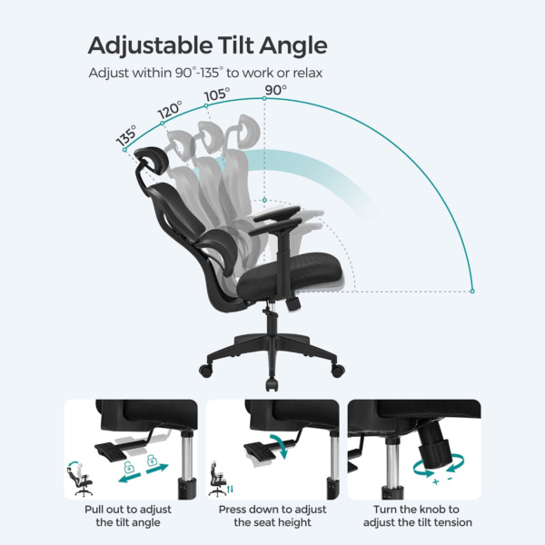 - Reguliuojamas galvos atlošas ir 4 pakopų reguliuojamas atlošas leidžia patogiai sėdėti dirbant ar ilsintis