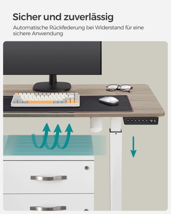 • Kad apsaugotumėte stalviršį nuo smūgių ir įbrėžimų, nustatykite didesnę įmontuoto jutiklio vertę, kad reguliuojant aukštį būtų aptikti kieti daiktai.