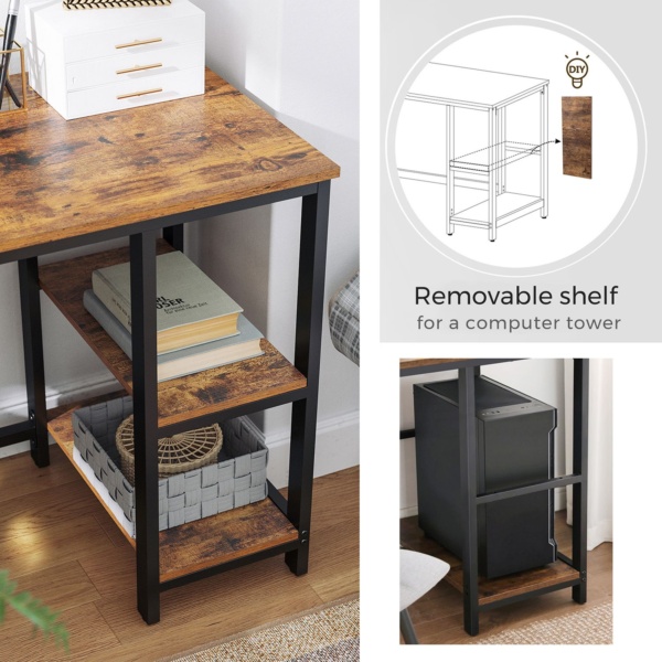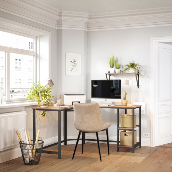 Sėskite prie stalo, kuris daro tokį pat gerą įspūdį kaip ir jūsų darbas. Šis pramoninio dizaino kompiuterio stalas turi juodą metalinį rėmą, vintažinės išvaizdos paviršių ir lentynas. L formos biuro baldą (138L x 138W x 75H cm) galima įrengti beveik bet kuriame biure, kur reikia vietos taupančios alternatyvos gremėzdiškiems milžiniškiems stalams. Stalą naudokite rašymui, darbui, žaidimams, mokymuisi ar kitai mėgstamai veiklai.