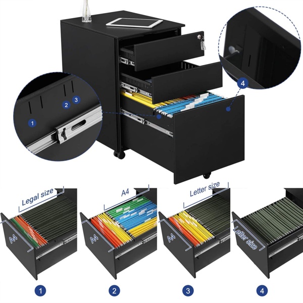 Nesijaudinkite dėl šios dokumentų spintos stabilumo! Viršuje esantys du stalčiai gali išlaikyti iki 15 kg, o apatinis stalčius su pakabinamomis bylomis – iki 20 kg. Dėl aukščiausios kokybės pilnai ištraukiamų bėgių stalčiai lengvai ištraukiami net ir esant didelėms apkrovoms. Dokumentų spinta turi 5 ratukus, todėl ją galima lengvai perkelti bet kur.