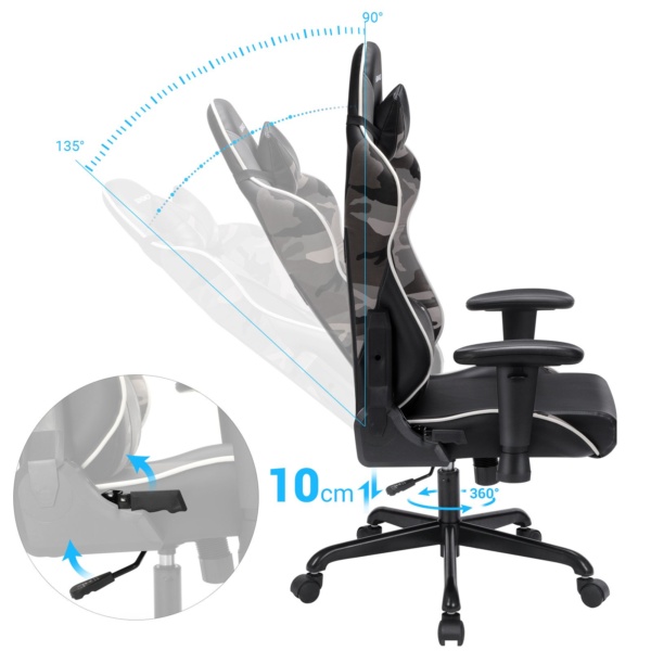 Ši lenktynių kėdė sukurta tikriems žaidėjams! Jei mėgstate greitį, stilių ir kompiuterinius žaidimus, ant šios kėdės patirsite nuostabių akimirkų. Jos ergonomiškas dizainas užtikrina aukštą komforto lygį net po ilgų žaidimų sesijų. Dėl supimo funkcijos lengva suptis pirmyn ir atgal, o tai mažina nuovargį. Sėdynės aukštį ir atlošo kampą taip pat galima lanksčiai reguliuoti, kad šią kėdę galėtumėte puikiai pritaikyti savo poreikiams. Automatinio grįžimo cilindras taip pat išlaikė TÜV Rheinland saugos bandymą pagal DIN 4550, 4 klasė (sertifikatas išduotas: tiekėjui). Sėdėdami ant šios rašomosios kėdės jausitės tarsi sėdėdami už galingo sportinio automobilio vairo – tiek daug galios!